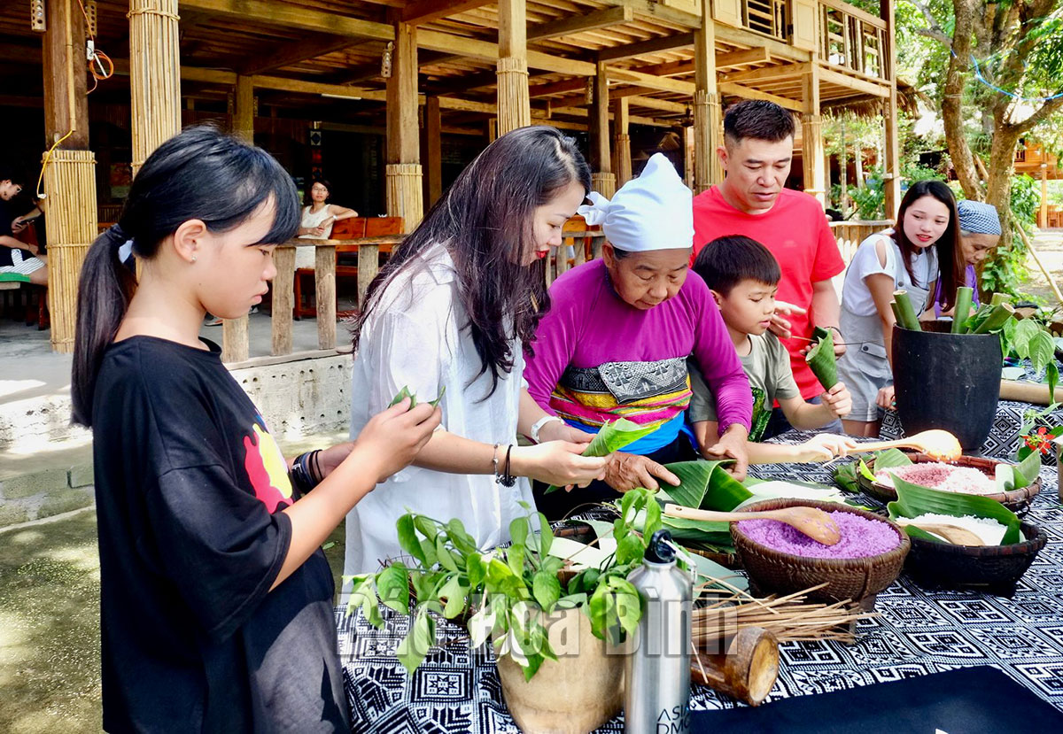 Du khách trải nghiệm quy trình làm ẩm thực của đồng bào Thái tại điểm du lịch cộng đồng bản Hịch, xã Mai Hịch (Mai Châu)